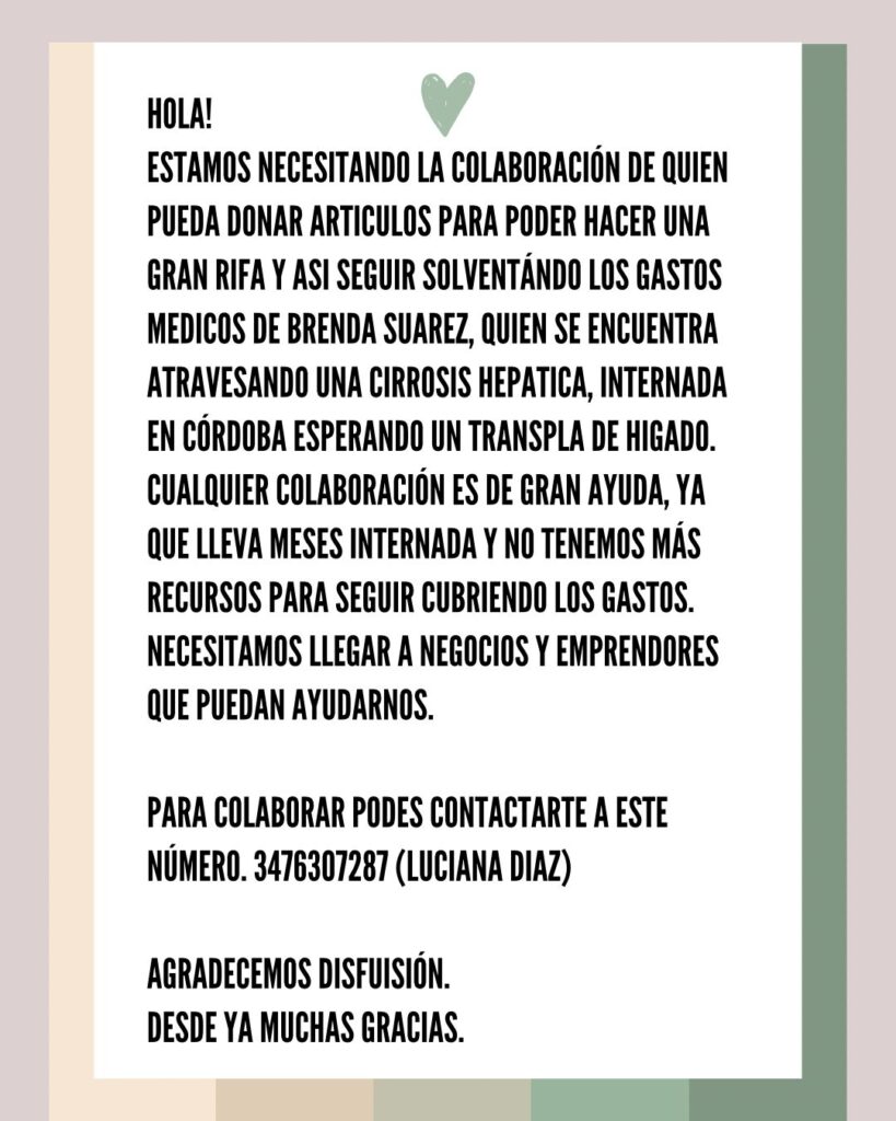 Mientras se espera que llegue el hígado para Brenda, hay que dar una mano. Quienes quieran y puedan hacerlo, deben comunicarse al número de Luciana Natali Díaz, la prima de Brenda: 3476 307287. Ella proporcionará el alias de la cuenta bancaria a la cual se podrá transferir el dinero que tanto se necesita.