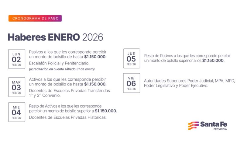 El Gobierno Provincial, a través del Ministerio de Economía, informó que los haberes del mes de enero se percibirán a partir del lunes 2 de febrero y concluirán el viernes 6. Los pasivos a los que les corresponde percibir un monto de bolsillo de hasta $1.150.000 tendrán acreditado el cobro el sábado 31 de enero, al igual que los trabajadores policiales y penitenciarios.
