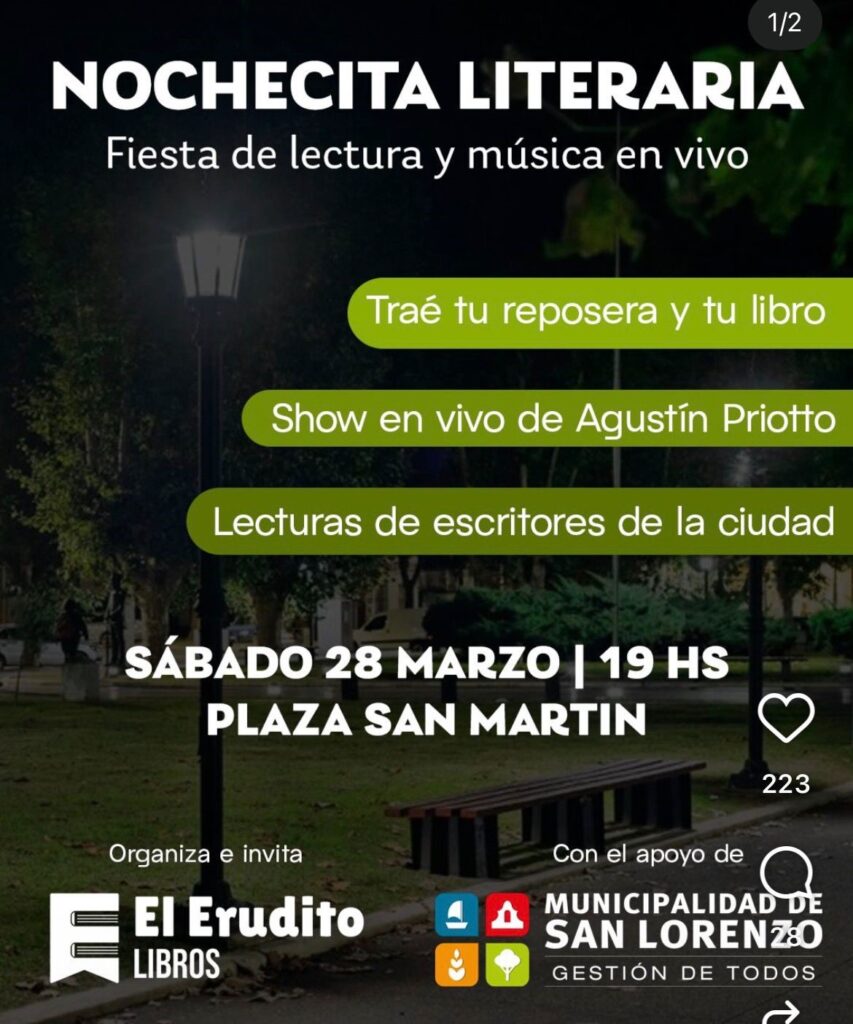 Este sábado, 28 de marzo, desde la hora 19, tendrá lugar en la Plaza San Martín (Urquiza y General López) de San Lorenzo la «Nochecita literaria», una jornada descripta como de «Fiesta de lectura y música en vivo».