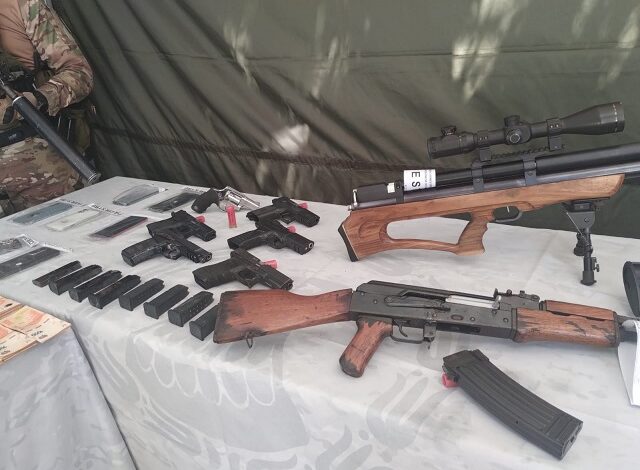 El hallazgo incluyó pistolas calibre 9 milímetros y calibre .40, varias de ellas de marcas como Glock y de última generación, además de fusiles calibre 5.56 y .223 de fabricación china y norteamericana, junto con escopetas y otras armas largas.