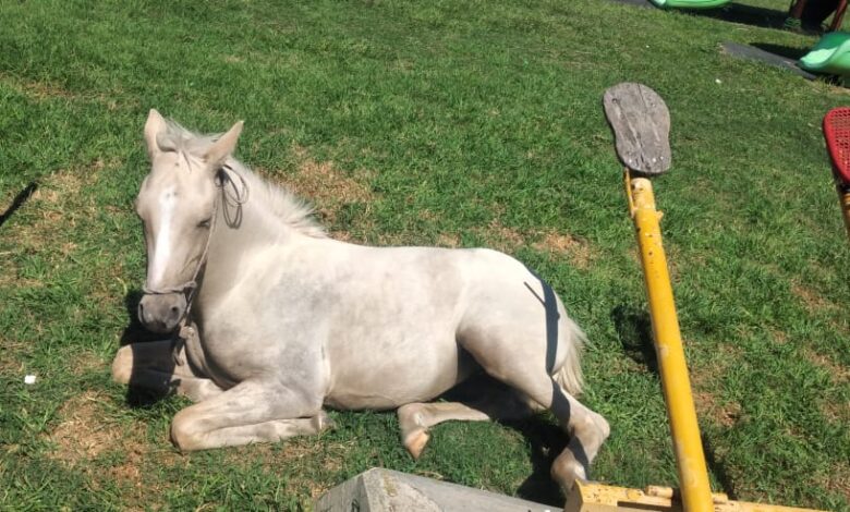 El hecho se registró cerca de las 13:30 en la intersección de Rivadavia y Thomson. Allí, en el sector de juegos del espacio público, el animal se encontraba recostado sobre uno de sus lados sin poder levantarse.